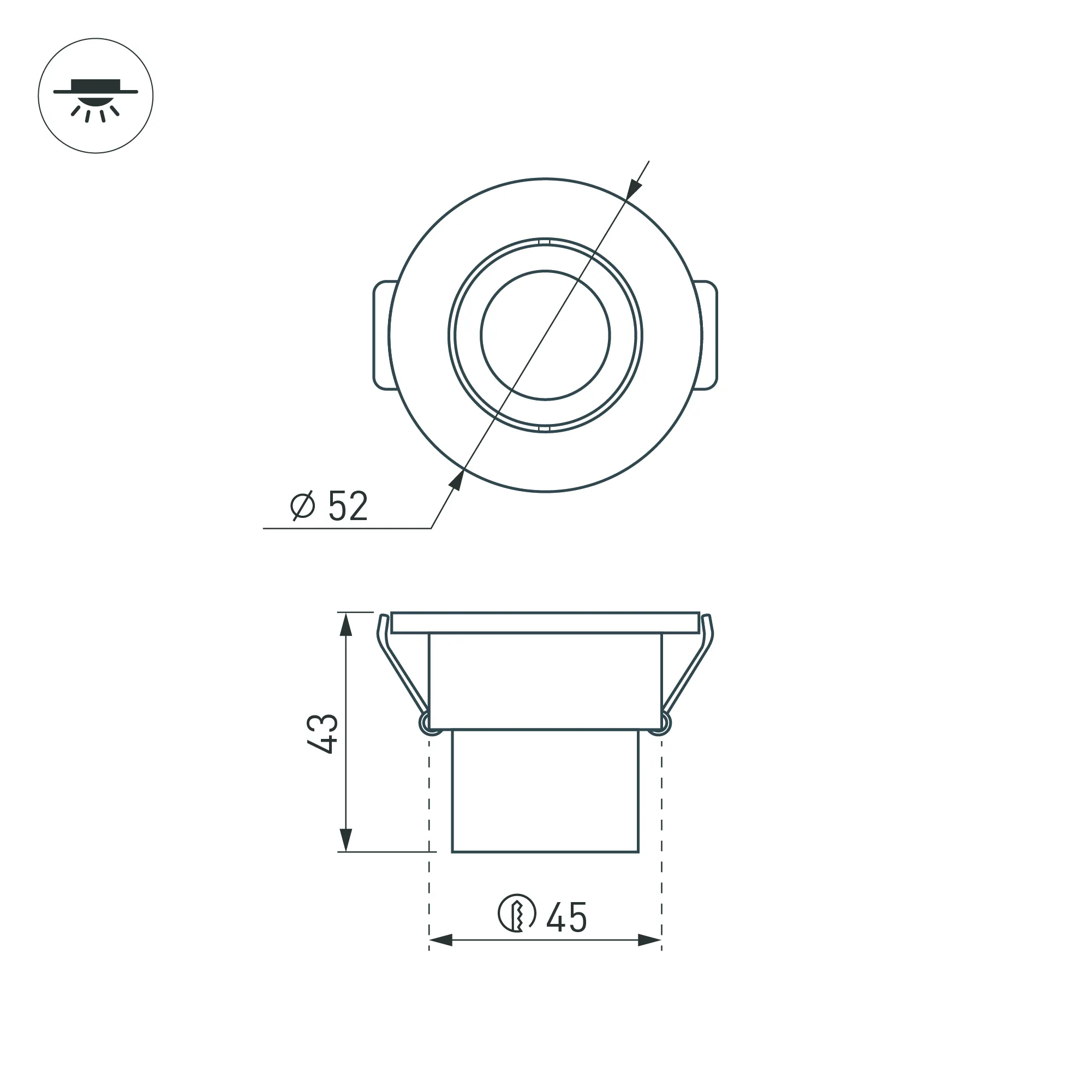 Врезной круглый мебельный светильник 3Вт, корпус белый алюминий. Цвет ДНЕВНОЙ БЕЛЫЙ 4000-4500K. Светодиод 1х3W CREE XPE. Св.поток 140-160лм, наклоняемая ось, угол 30°. Питание 180-240VAC, 3Вт, 700mA 3-5V, драйвер в комплекте. Размеры d52x43 мм, врезное отверстие d45 мм.