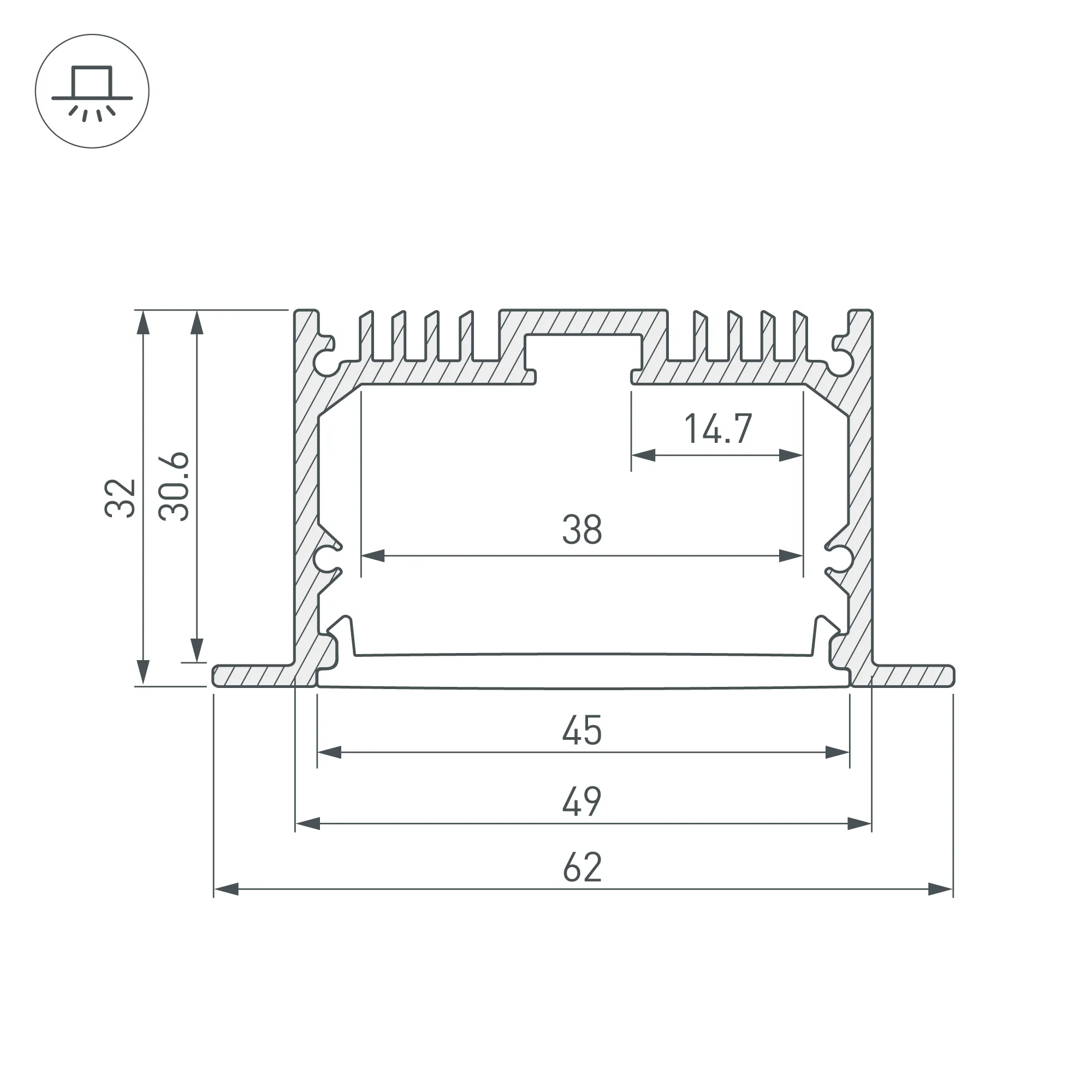 Алюминиевый анодированный профиль для светодиодных лент и линеек. Габаритные размеры (L×W×H): 2000x62x32 мм, паз для установки 49 мм. Ширина площадки для ленты 38 мм. Экраны, заглушки и другие аксессуары приобретаются отдельно. Цена за 1 метр.