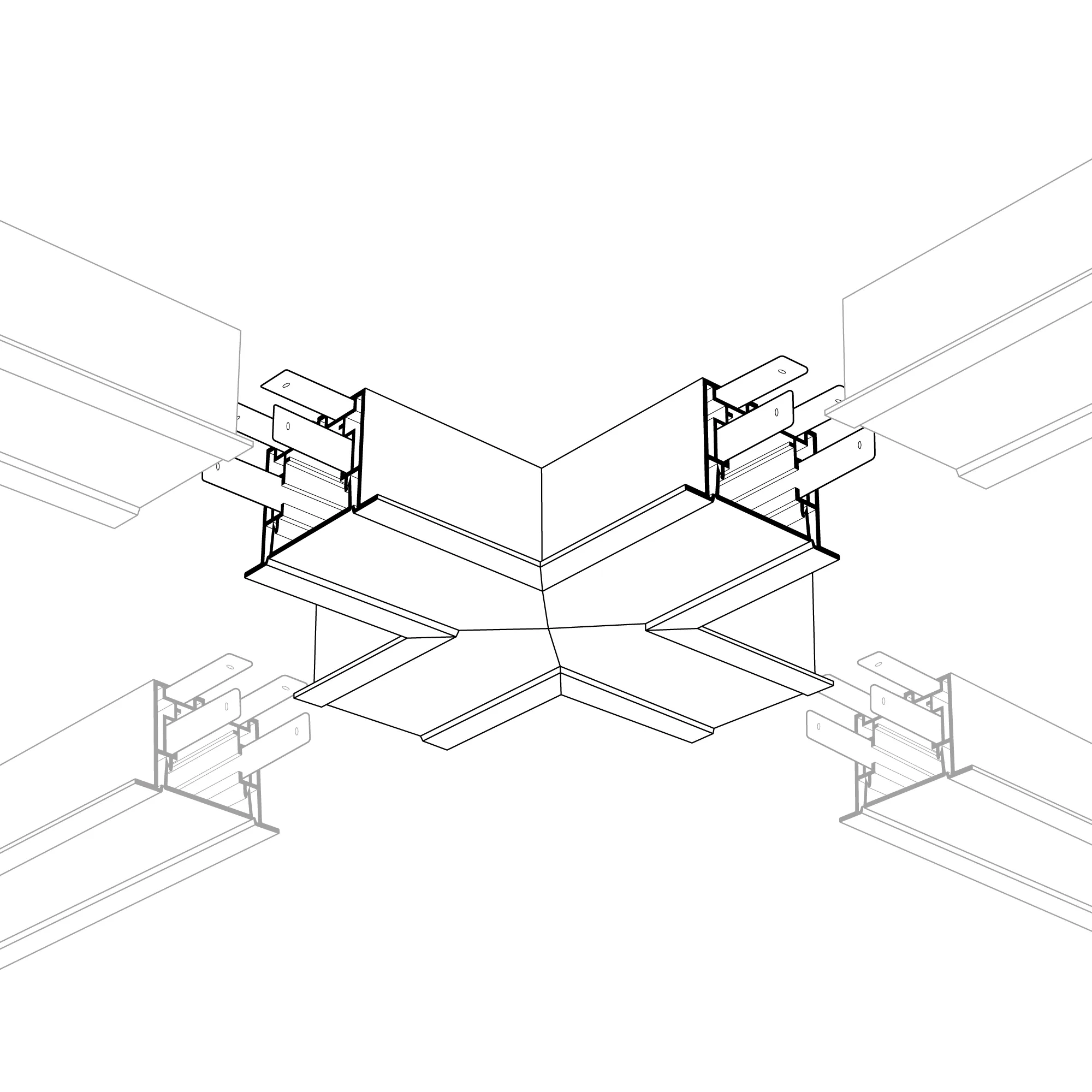 Крестовой угол в сборе, для соединения 4-х профилей S2-LINIA55-F под прямыми углами 90°. Экран образует линию "Х" на плоскости. В комплекте матовый экран, соединители. Размеры 150х150 мм.