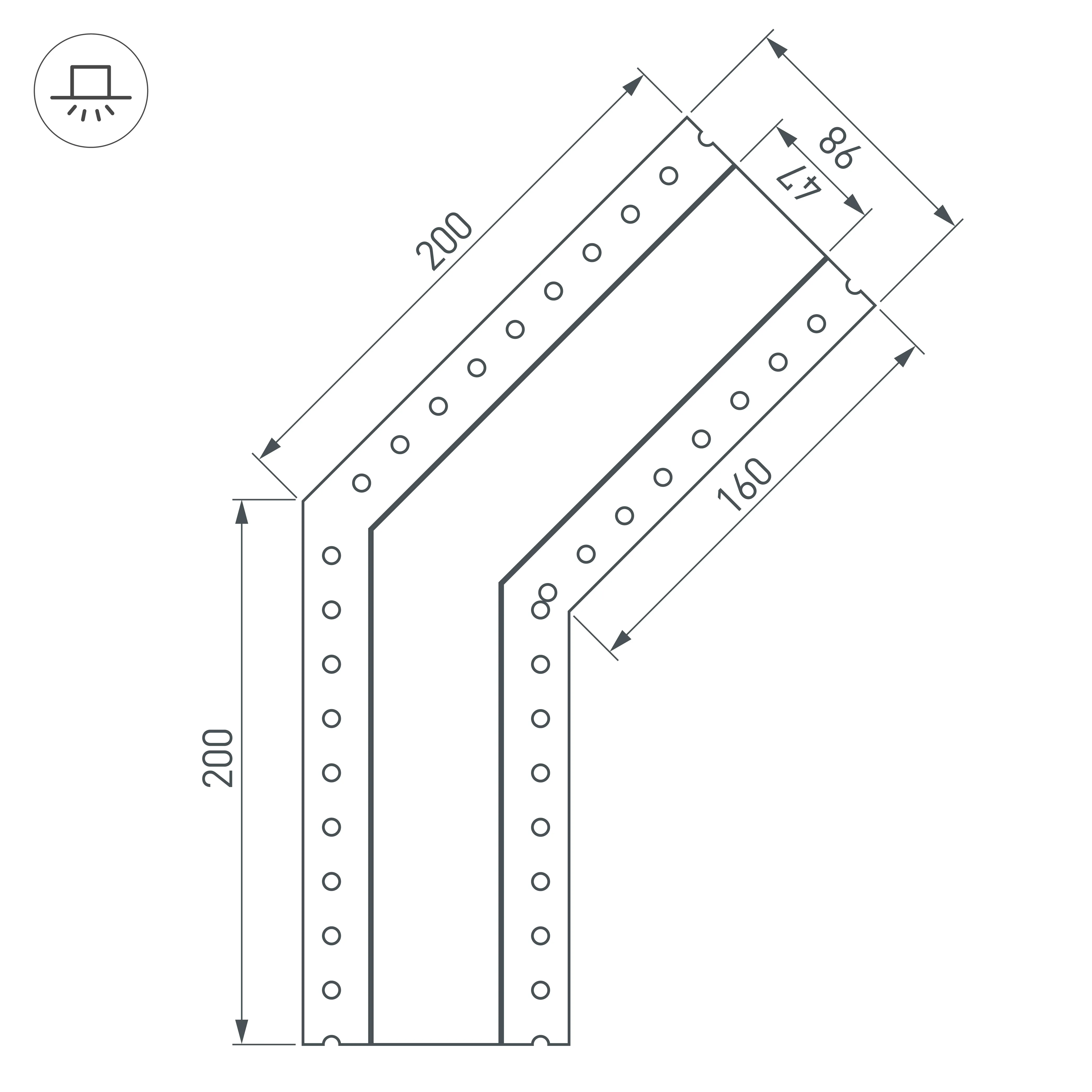 Под заказ от 4 шт. Угол в сборе, для профиля SL-LINIA45-FANTOM. Угол 135°. В комплекте угол с экраном, соединители, винты, шестигранный ключ.