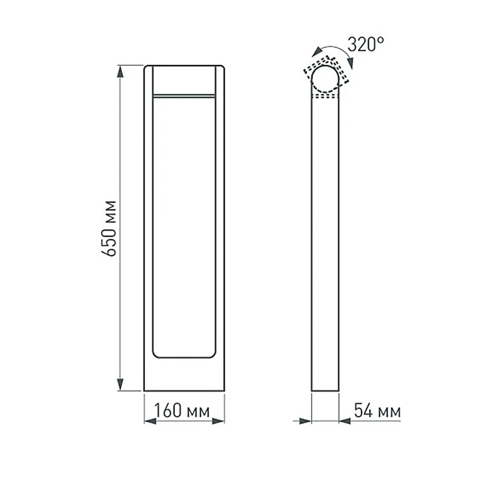 650мм уличный светодиодный светильник для дорожек, изменяемый угол освещения (111 градусов), на 2 стороны. Цвет ТЕПЛЫЙ БЕЛЫЙ 3000К, светодиоды 6Вт SMD (275 лм). Влагозащищенный корпус IP65 - черный алюминий, экран ударопрочный PC. Питание 230В, мощность 6 Вт. Размеры ВхШхГ 650х160х54 мм.