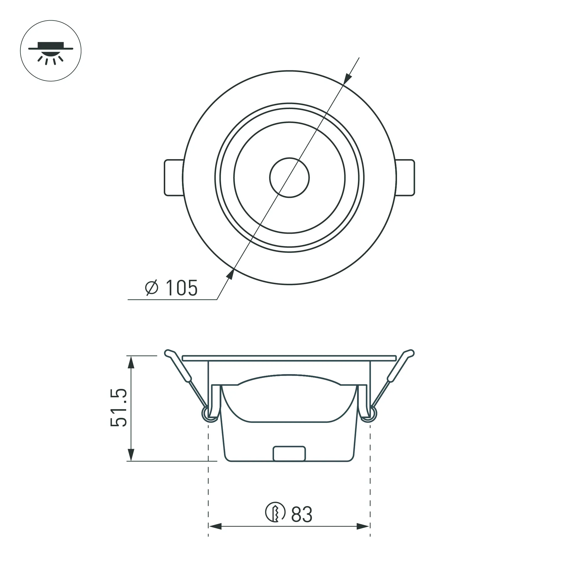 Встраиваемый поворотный светильник "даунлайт". Мощность 10 Вт, св. поток 900 лм, 90 лм/Вт, теплый 3000 K, CRI>80, UGR<19, угол 36°, напряжение питания 230 В. Белый круглый корпус из теплопроводящего полиамида, степень защиты IP20, угол поворота оси 30°. Размер: диаметр 105 мм, высота 51.5 мм. Монтаж встраиваемый, установочное отверстие диаметр 83-95 мм. Пульсация <2%.