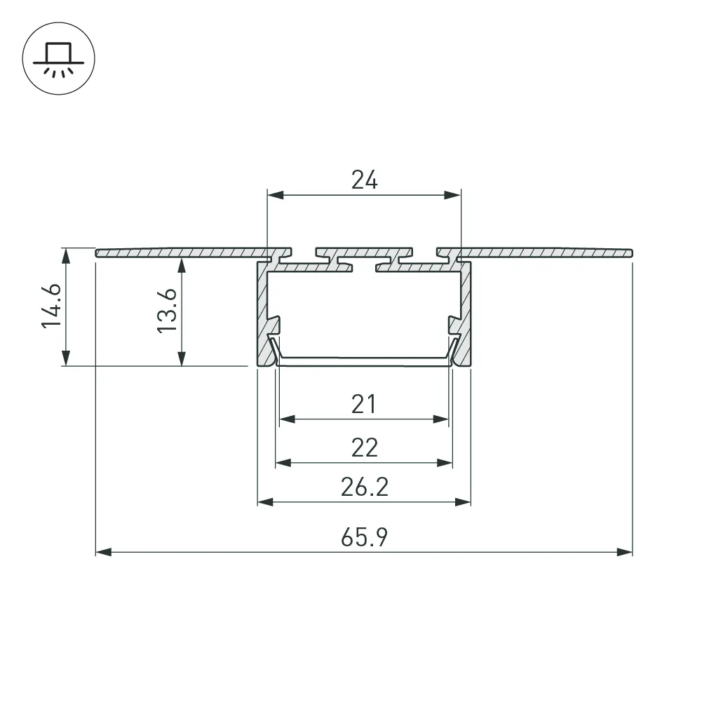 Алюминиевый профиль для светодиодных лент и линеек, встраиваемый в гипсокартон толщиной 12 мм, под строительную отделку. Позволяет создать линию света шириной 22 мм. без видимых частей алюминия. Монтируется между двумя листами гипсокартона. Габаритные размеры (L×W×H): 2000x65,9x14,6 мм. Ширина площадки для ленты 24 мм. Экраны, заглушки и другие аксессуары приобретаются отдельно. Цена за 1 метр.