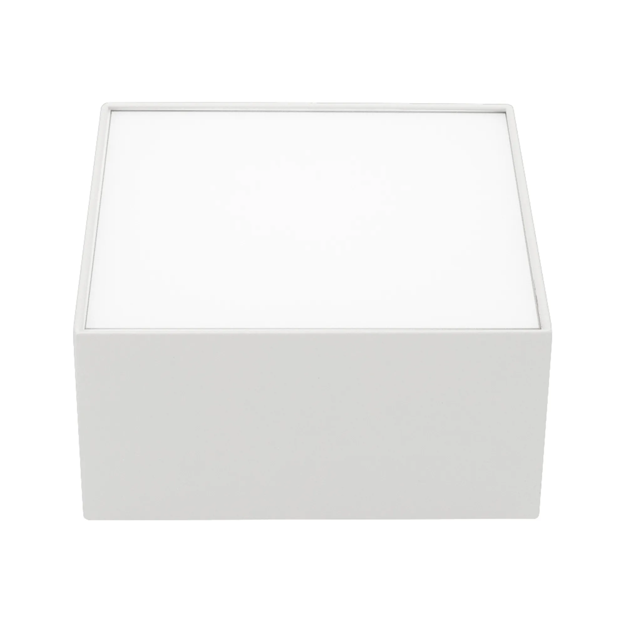 Накладной светильник. Мощность 13 Вт, св. поток 540-680 лм, 52 лм/Вт, теплый 3000 K, CRI>90, угол 120°, напряжение питания 230 В. Белый квадратный корпус из алюминия, экран PC, степень защиты IP40. Размер: длина 120 мм, ширина 120 мм, высота 59 мм. Монтаж накладной. Драйвер 20-40 В, 300 мА, пульсация <5%.