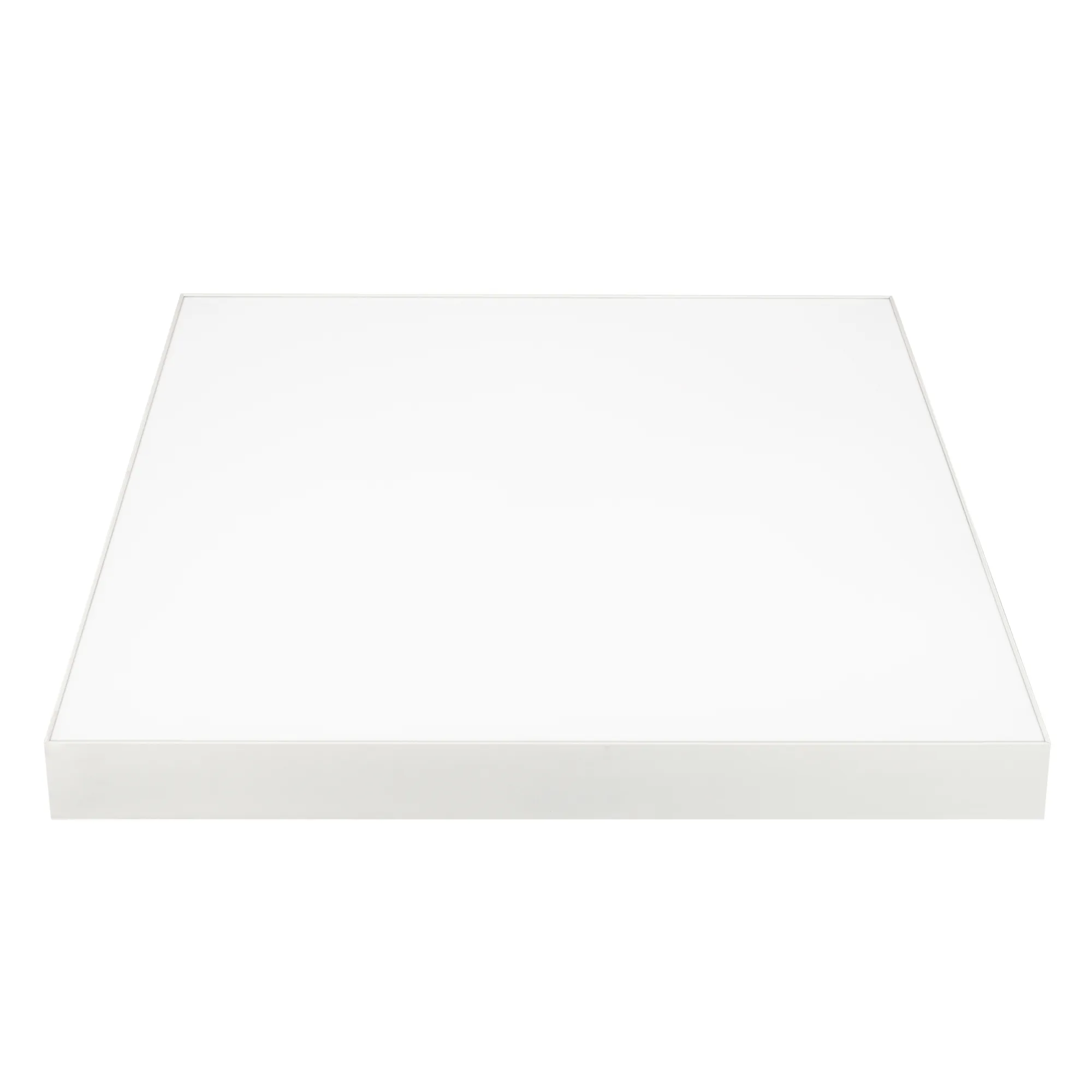 Накладной светильник. Мощность 60 Вт, св. поток 4900-5500 лм, 80-90 лм/Вт, теплый 3000 K, CRI>90, угол 120°, напряжение питания 230 В. Белый квадратный корпус из алюминия, экран PC, степень защиты IP40. Размер: длина 600 мм, ширина 600 мм, высота 64 мм. Монтаж накладной. Драйвер 27-40 В, 1400 мА, пульсация <5%.