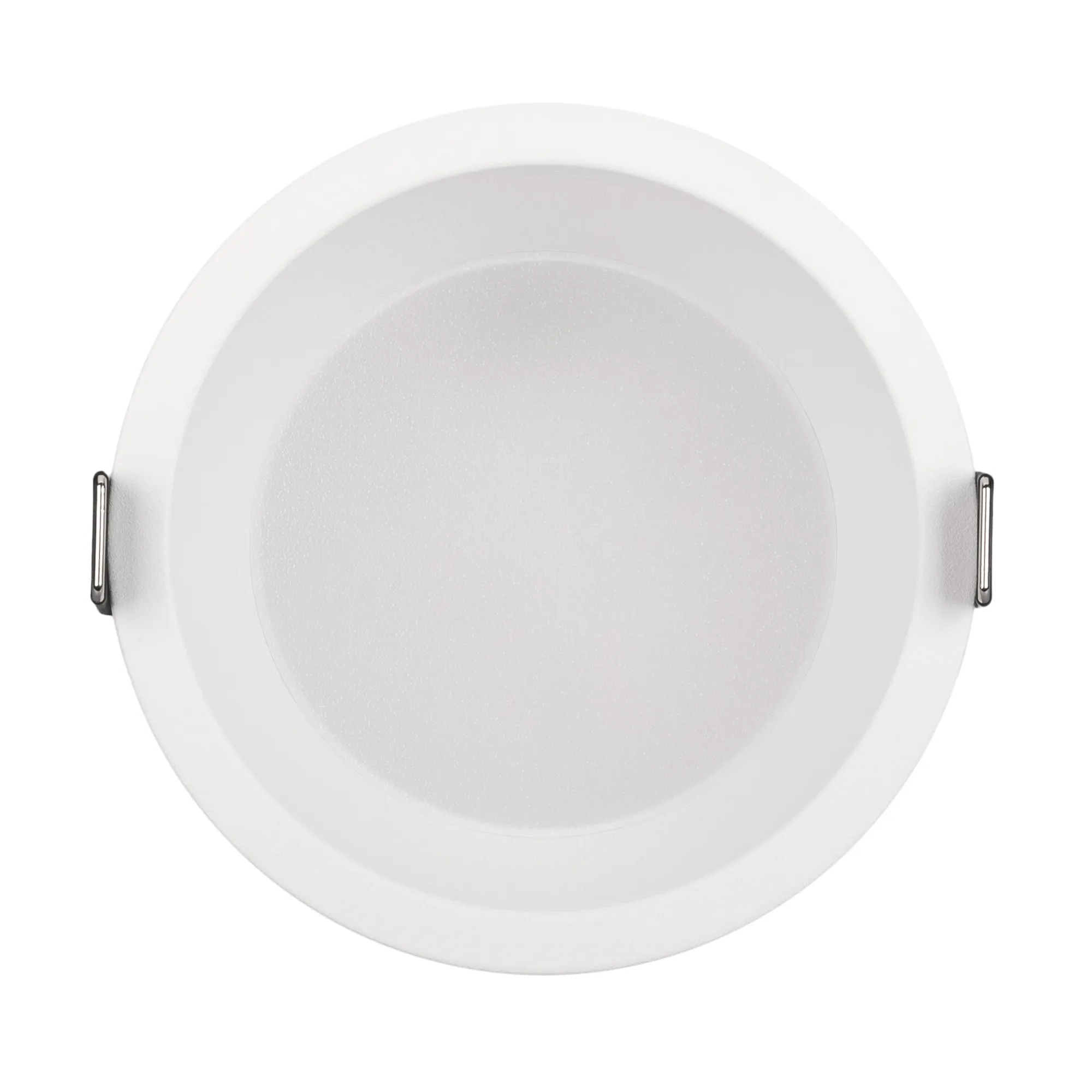 Встраиваемый светильник даунлайт. Мощность 12 Вт, св. поток 840 лм, 70 лм/Вт, дневной 4000 K, CRI>90, угол 90°, напряжение питания 230 В. Белый круглый корпус из алюминия, степень защиты IP20. Размер: диаметр 104 мм, высота 55 мм. Монтаж встраиваемый, установочное отверстие: диаметр 95 мм. Драйвер 27-42 В, 300 мА, пульсация <2%.