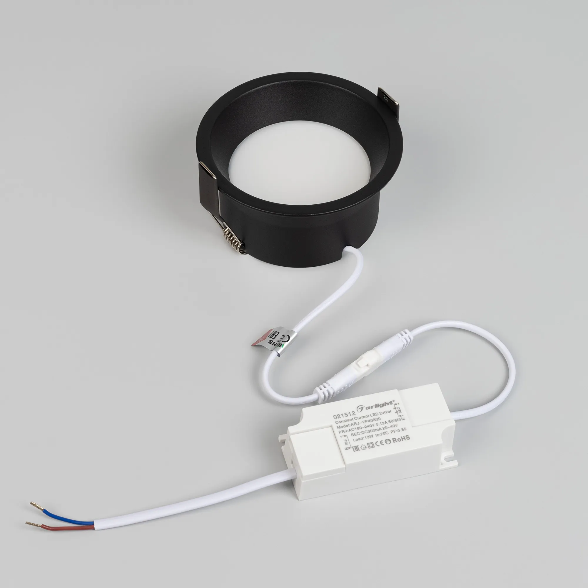 Встраиваемый светильник даунлайт. Мощность 12 Вт, св. поток 670 лм, 56 лм/Вт, дневной 4000 K, CRI>90, угол 85°, напряжение питания 230 В. Чёрный круглый корпус из алюминия, степень защиты IP20. Размер: диаметр 104 мм, высота 55 мм. Монтаж встраиваемый, установочное отверстие: диаметр 95 мм. Драйвер 27-42 В, 300 мА, пульсация <2%.