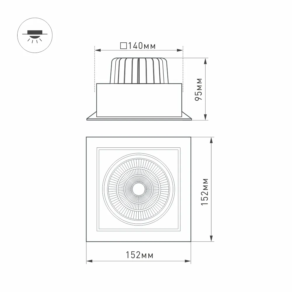 Встраиваемый карданный светильник. Угол 30° / 25Вт / ТЕПЛЫЙ БЕЛЫЙ 3000K / 2200лм, CRI>90. Корпус черный. Питание AC220-240V, 25Вт, 700mA 30-42V, драйвер в комплекте. Размеры LxWxH: 152х152x95мм, отверстие для установки 140x140мм.