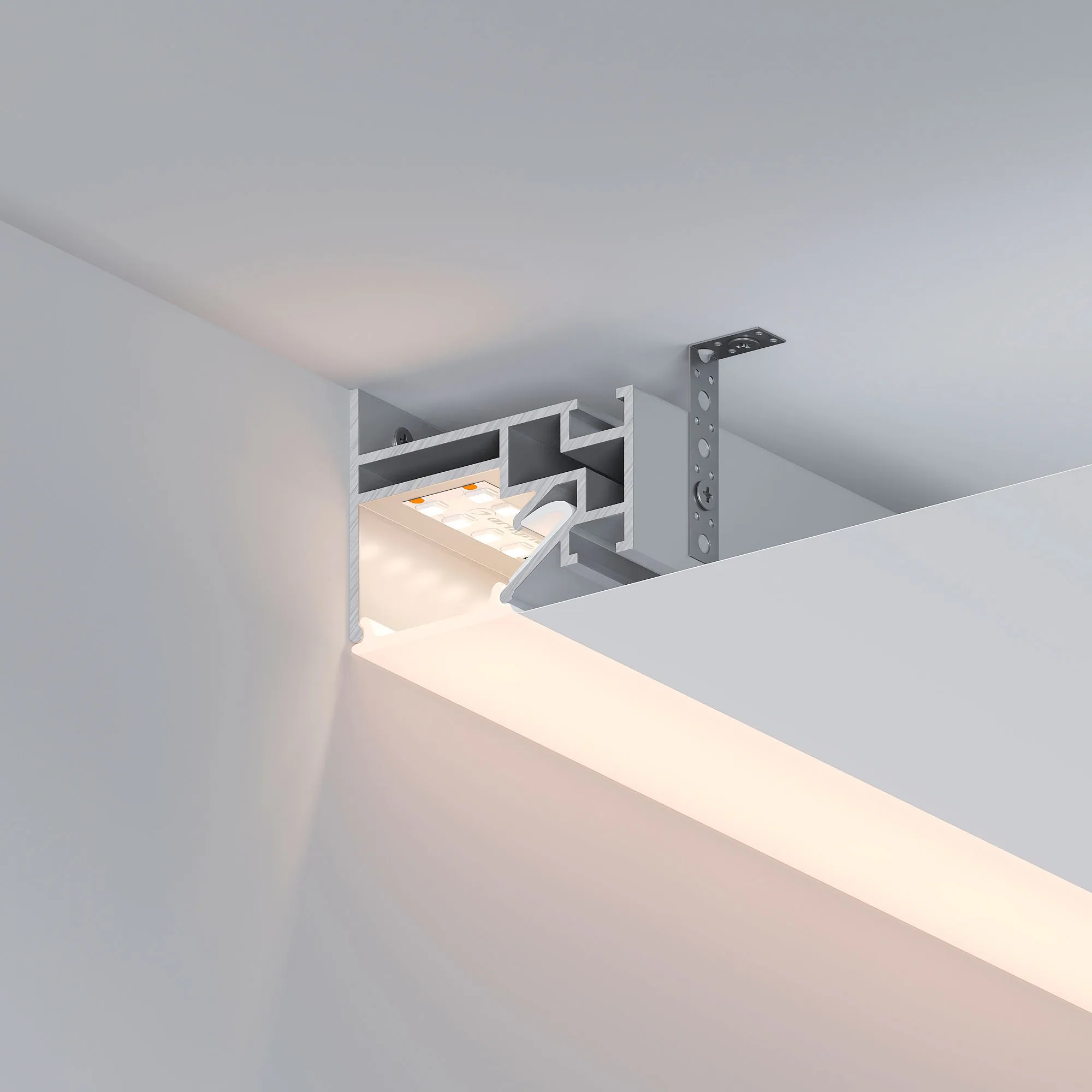 Алюминиевый профиль для натяжных потолков (боковая линия). Решение 2-в-1 - каркас для крепления натяжного потолка и профиль для установки светодиодной ленты. Для дизайнерских решений «линии света» в натяжных потолках. Монтируется к стене накладным способом. Ширина площадки для ленты 26 мм. Длина 2000 мм. Цена за 1 м.