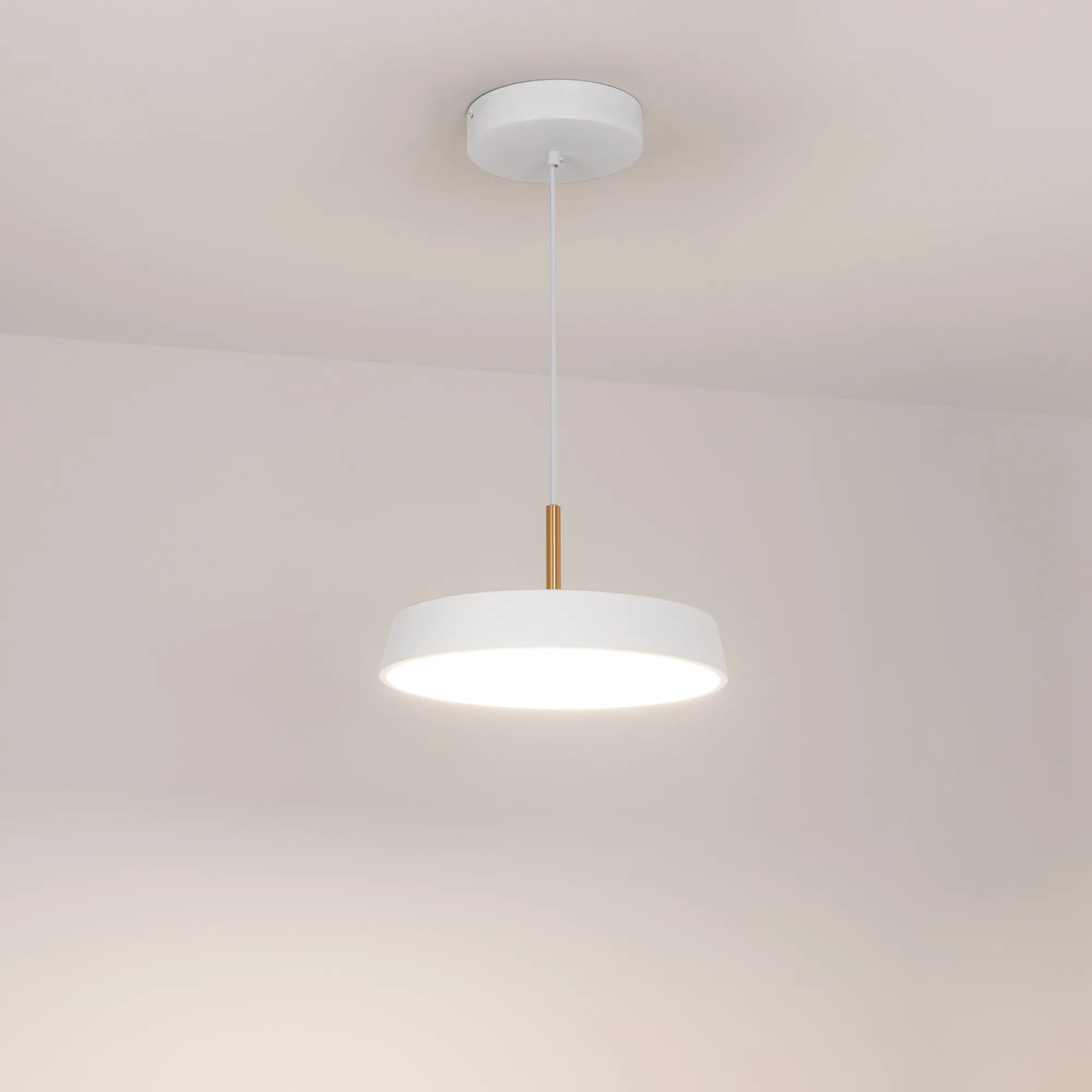 Подвесной светильник. Мощность 17 Вт, св. поток 1258 лм, 74 лм/Вт, дневной 4000 K, CRI>80, угол 120°, напряжение питания 230 В. Белый круглый корпус из стали, экран PMMA, степень защиты IP20. Размер: диаметр 300 мм, высота 50 мм, размер чаши: диаметр 160 мм, высота 35 мм. Монтаж подвесной, длина подвеса 1200мм. Драйвер 42-70 В, 300 мА, пульсация <5%.
