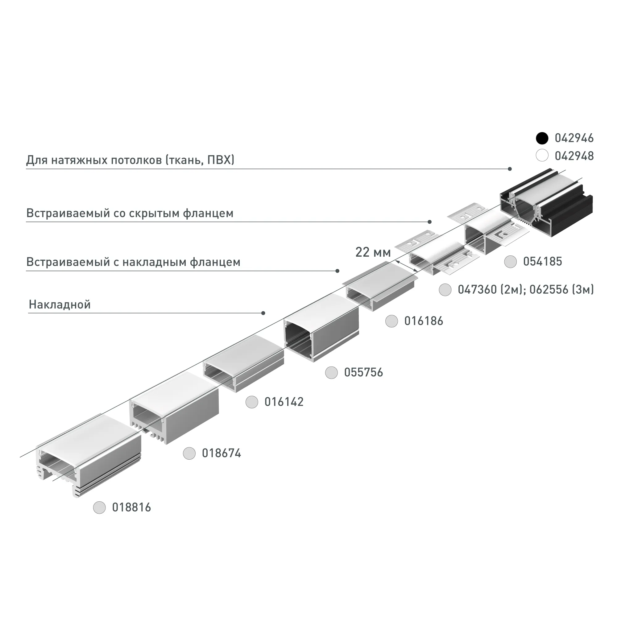 Алюминиевый профиль для светодиодных лент и линеек. Скрытая установка (под строительную отделку). Габаритные размеры (L×W×H): 2000x53,5x9,8 мм. Ширина площадки для ленты 18,9 мм. Экраны, заглушки и другие аксессуары приобретаются отдельно. Цена за 1 метр.