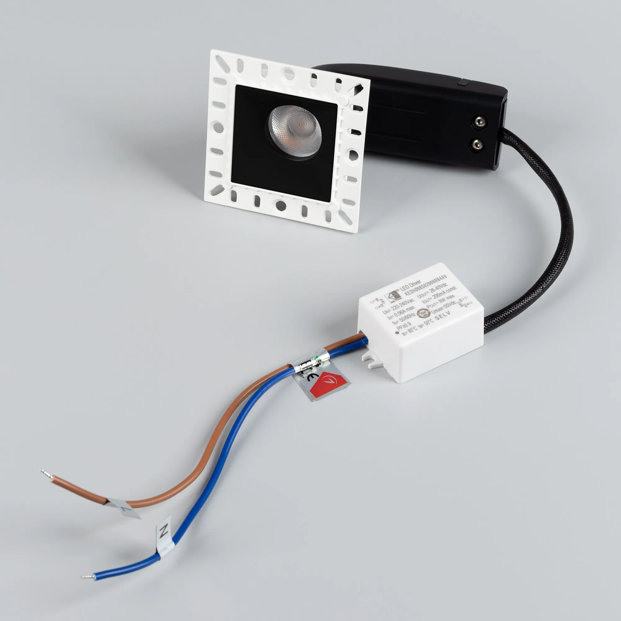 Встраиваемый безрамочный светильник под шпаклевку. Мощность 9 Вт, св. поток 700 лм, 78 лм/Вт, дневной 4000 K, CRI>90, угол 36°, напряжение питания 230 В. Чёрный квадратный корпус, экран PMMA, степень защиты IP20. Размер: длина 65 мм, ширина 65 мм, высота 63 мм, размер отражателя 40x40 мм. Монтаж встраиваемый, установочное отверстие длина 45 мм, ширина 45 мм. Драйвер 26-40 В, 200 мА, пульсация <2%.