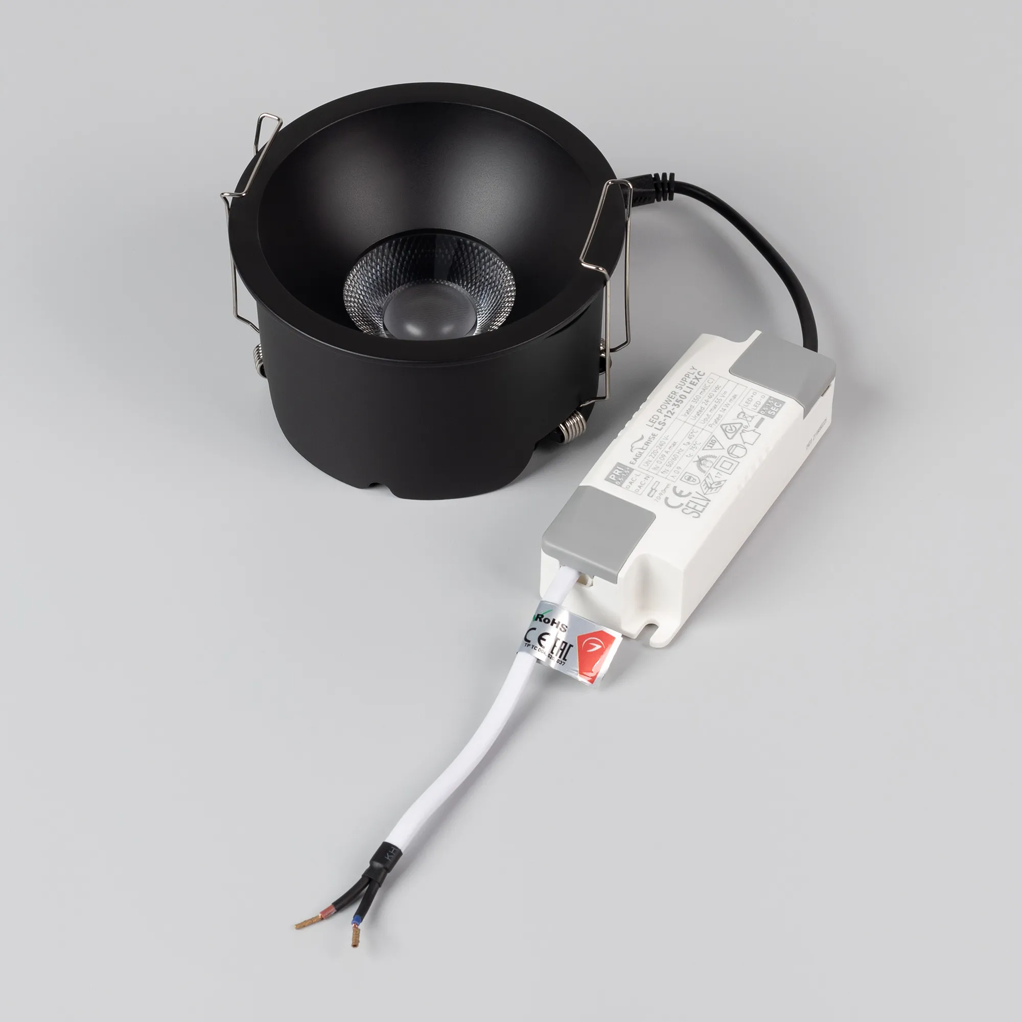 Встраиваемый светильник даунлайт. Мощность 15 Вт, св. поток 1260 лм, 84 лм/Вт, тёплый 3000 K, CRI>90, угол 50°, напряжение питания 230 В. Чёрный круглый корпус из алюминия, степень защиты IP20. Размер: диаметр 106 мм, высота 63 мм. Монтаж встраиваемый, установочное отверстие: диаметр 95 мм. UGR<14. Драйвер 27-40 В, 350 мА, пульсация <2%.