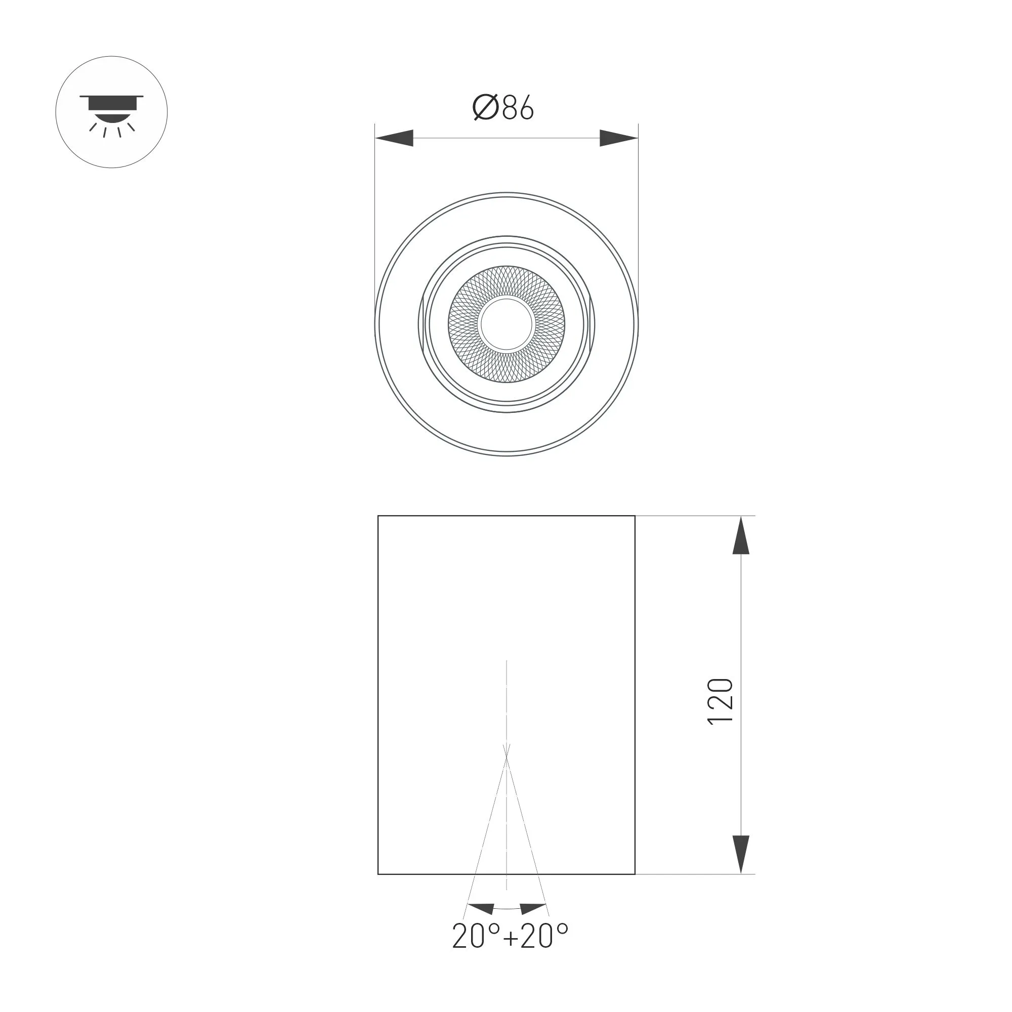 Накладной интерьерный светильник. Мощность 10 Вт, св. поток 970 лм, 93 лм/Вт, теплый 3000 K, CRI>90, угол 24°, регулируемое направление луча 40° (20+20), поворотный световой модуль вокруг своей оси на 340°, UGR <18, напряжение питания 230 В. Белый круглый корпус из алюминия, степень защиты IP54. Размер: диаметр 86,5 мм, высота 120 мм. Монтаж накладной. Драйвер 27-43 В, 250 мА, пульсация <1%.