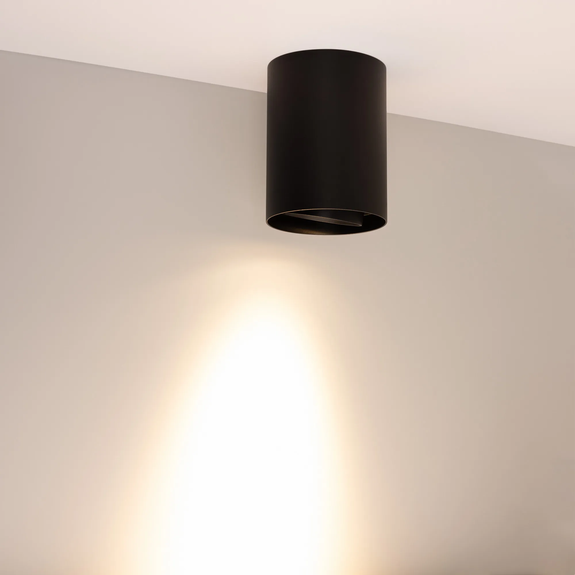 Накладной интерьерный светильник. Мощность 18 Вт, св. поток 1700 лм, 99 лм/Вт, теплый 3000 K, CRI>90, угол 24°, регулируемое направление луча 40°(20+20), поворотный световой модуль вокруг своей оси на 340°, UGR <11, напряжение питания 230 В. Чёрный круглый корпус из алюминия, степень защиты IP54. Размер: диаметр 110 мм, высота 145 мм. Монтаж накладной. Драйвер 27-43 В, 450 мА, пульсация <1%.