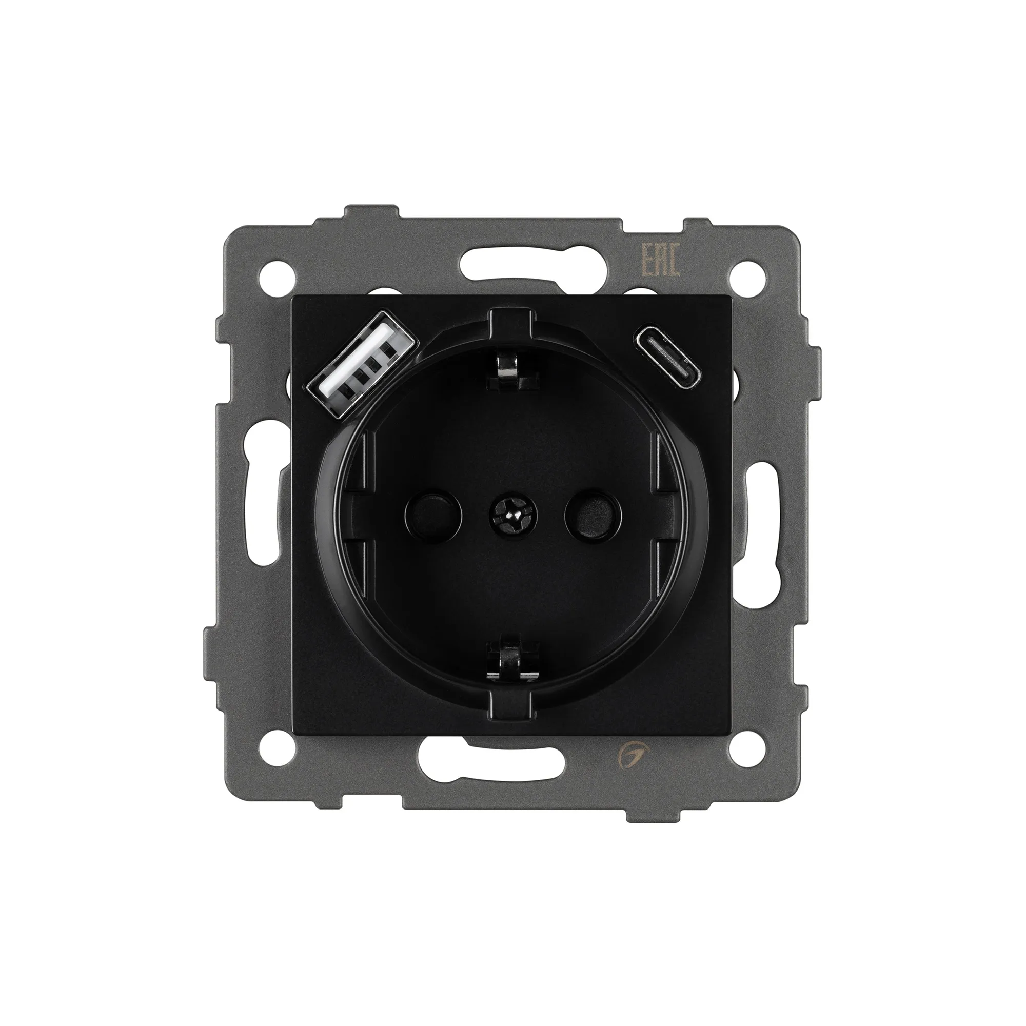 Механизм розетки с заземлением 1 пост 2 USB Type A+C порта. Цвет - черный. Без фронтальной рамки. Уровень пылевлагозащиты IP20. Устанавливается в стандартный подрозетник.