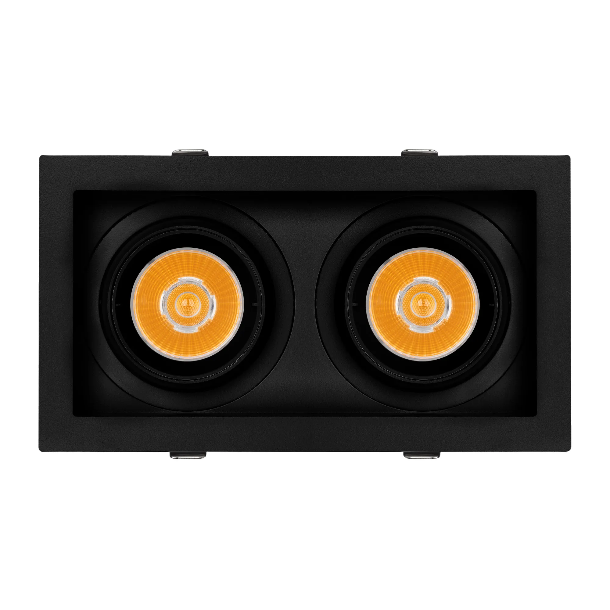 Поставка под заказ от 30 шт. Встраиваемый карданный светильник. Мощность 2х20 Вт, св. поток 4134 лм, 103 лм/Вт, тёплый 3000 K, CRI>92, угол 20°, напряжение питания 230 В. Чёрный корпус из алюминия, белая вставка, степень защиты IP20. Размер: длина 210 мм, ширина 117 мм, высота 105 мм. Монтаж встраиваемый, установочное отверстие: длина 190 мм, ширина 95 мм. Драйвер 24-42 В, 500 мА, пульсация <2%.