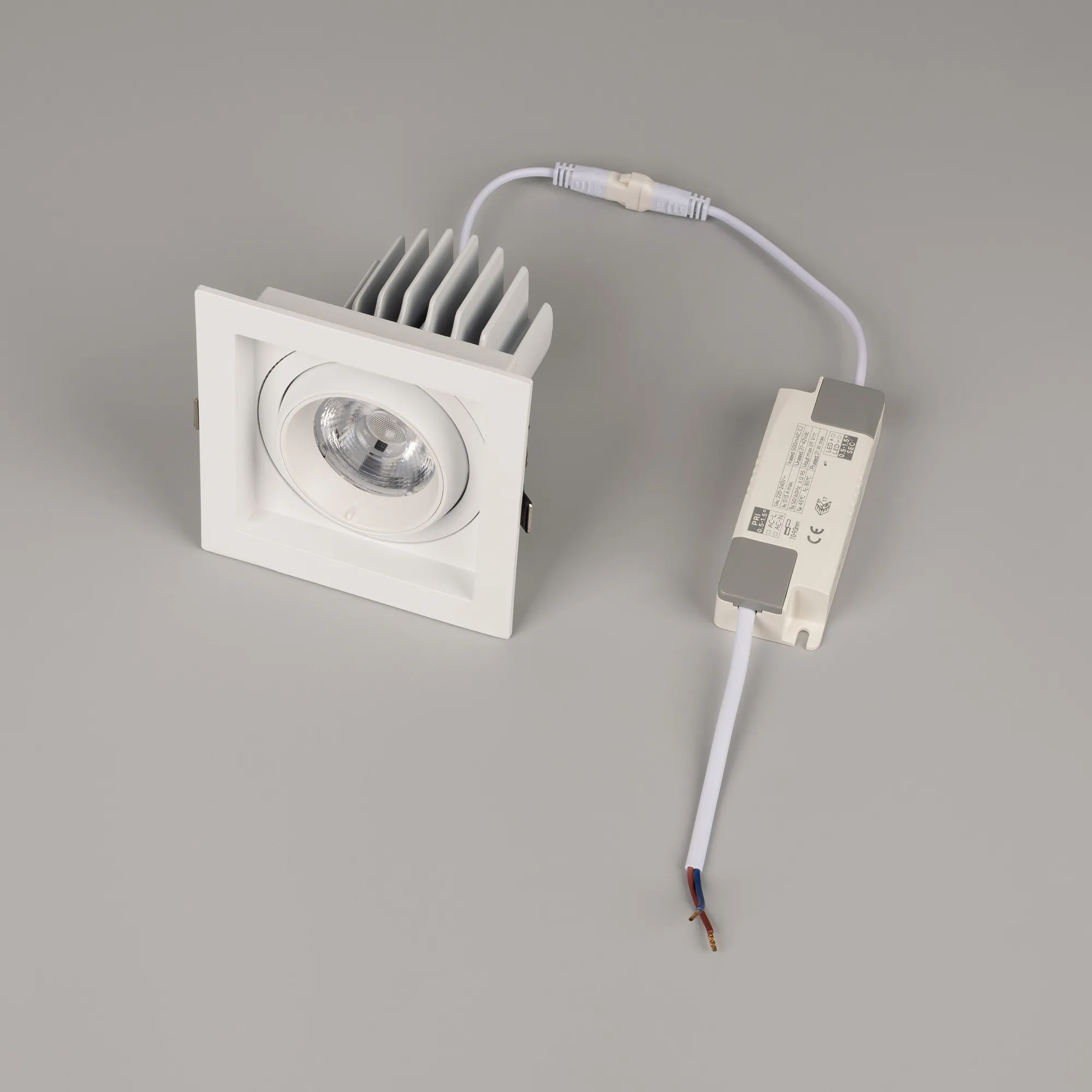 Встраиваемый карданный светильник. Мощность 20 Вт, св. поток 2132 лм, 107 лм/Вт, дневной 4000 K, CRI>92, угол 40°, напряжение питания 230 В. Белый корпус из алюминия, белая вставка, степень защиты IP20. Размер: длина 117 мм, ширина 117 мм, высота 105 мм. Монтаж встраиваемый, установочное отверстие: длина 95 мм, ширина 95 мм. Драйвер 24-42 В, 500 мА, пульсация <2%.