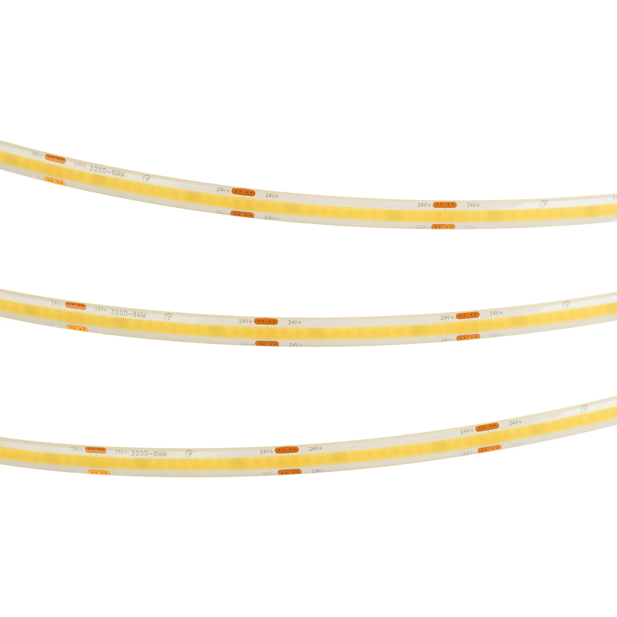 Светодиодная герметичная лента сплошного свечения COB серии X320, IP65 (SE - силиконовый верхний слой). Светодиоды CSP, 320 шт/м, белая плата шириной 8 мм, скотч 3M. Цвет свечения ТЕПЛЫЙ 2700K, индекс цветопередачи CRI>90, угол 150°. Мощность 8 Вт/м (45 Вт на 5м), питание 24 В. Размеры 5000х8х2.6 мм. Мин. отрезок 50 мм. Цена за 1 м. Рекомендуется установка на профиль.