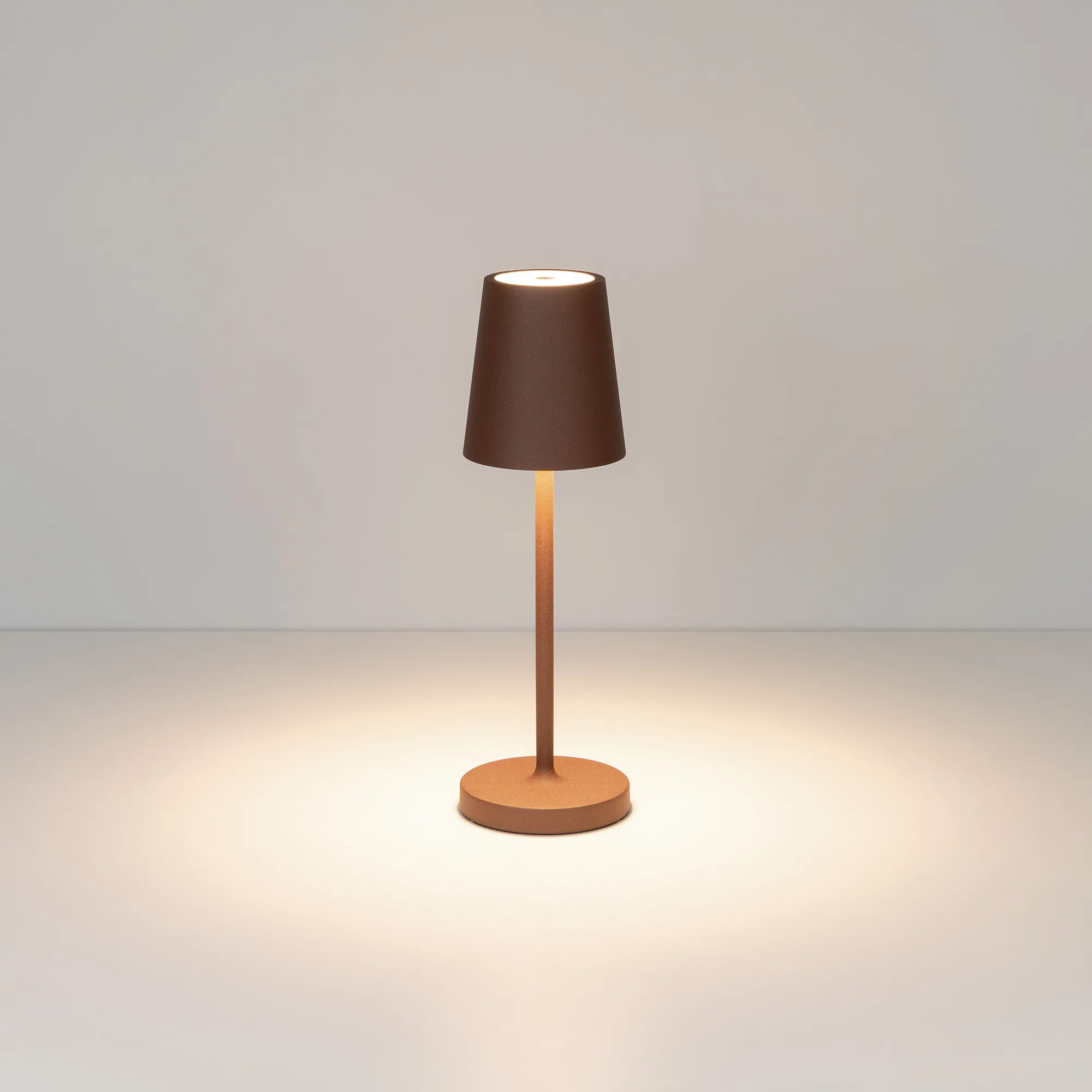 Настольный светильник со встроенным аккумулятором 1.5Вт, алюминиевый корпус, цвет терракотовый. Цвет ТЕПЛЫЙ БЕЛЫЙ 2200-2700-3000K, св.поток 110-130 лм, CRI(Ra)>80, угол 90°. Размер Ф75x250мм. IP54. Зарядка от сети переменного тока AC220-240V. Тип встроенного аккумулятора 1500мАч Li-ion, напряжение батареи 3.7V