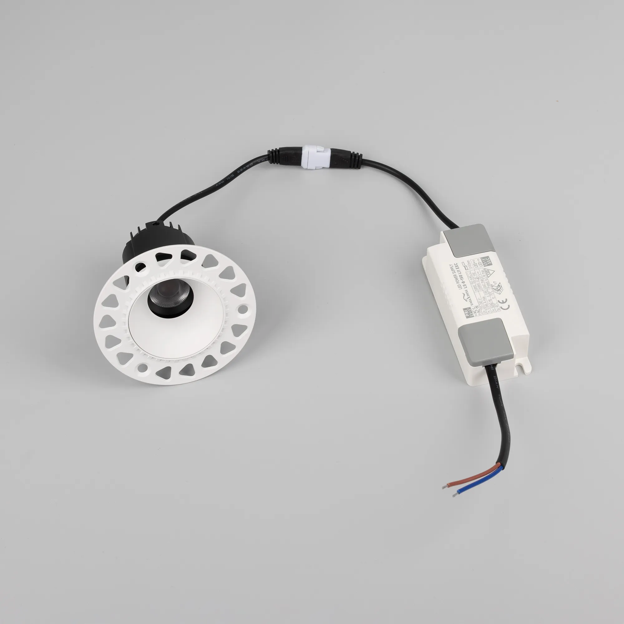 Встраиваемый светильник даунлайт. Мощность 7 Вт, св. поток 405 лм, 55 лм/Вт, теплый 3000 K, CRI>92, угол 24°, напряжение питания 230 В. Белый круглый корпус из алюминия, белый матовый отражатель, степень защиты IP20 . Размер: диаметр 85 мм, высота 72 мм. Монтаж встраиваемый, установочное отверстие: диаметр 55 мм. Драйвер, 27-42 В, 150 мА, пульсация <0,5%.