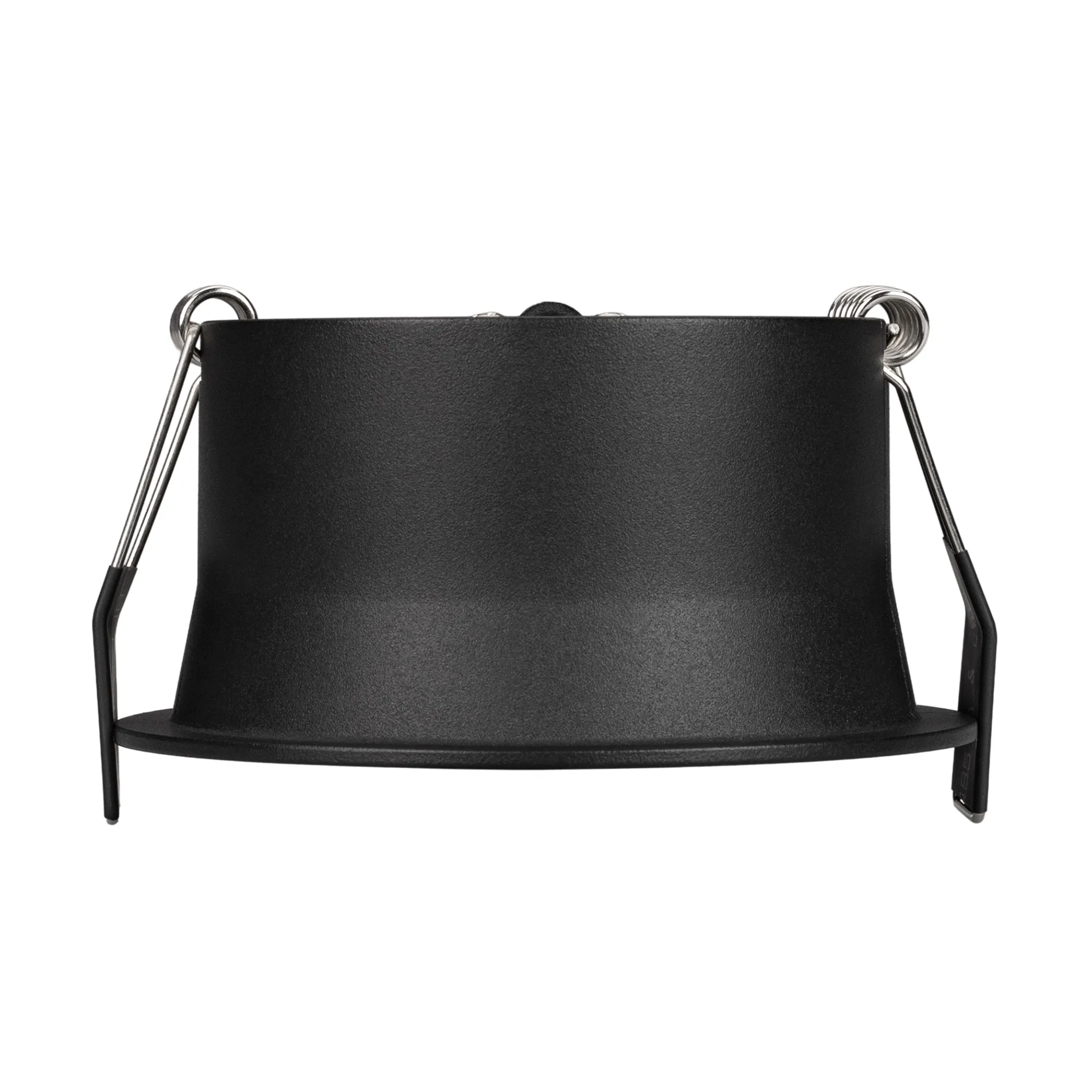 Встраиваемый светильник даунлайт. Мощность 12 Вт, св. поток 670 лм, 56 лм/Вт, дневной 4000 K, CRI>90, угол 85°, напряжение питания 230 В. Чёрный круглый корпус из алюминия, степень защиты IP20. Размер: диаметр 104 мм, высота 55 мм. Монтаж встраиваемый, установочное отверстие: диаметр 95 мм. Драйвер 27-42 В, 300 мА, пульсация <2%.