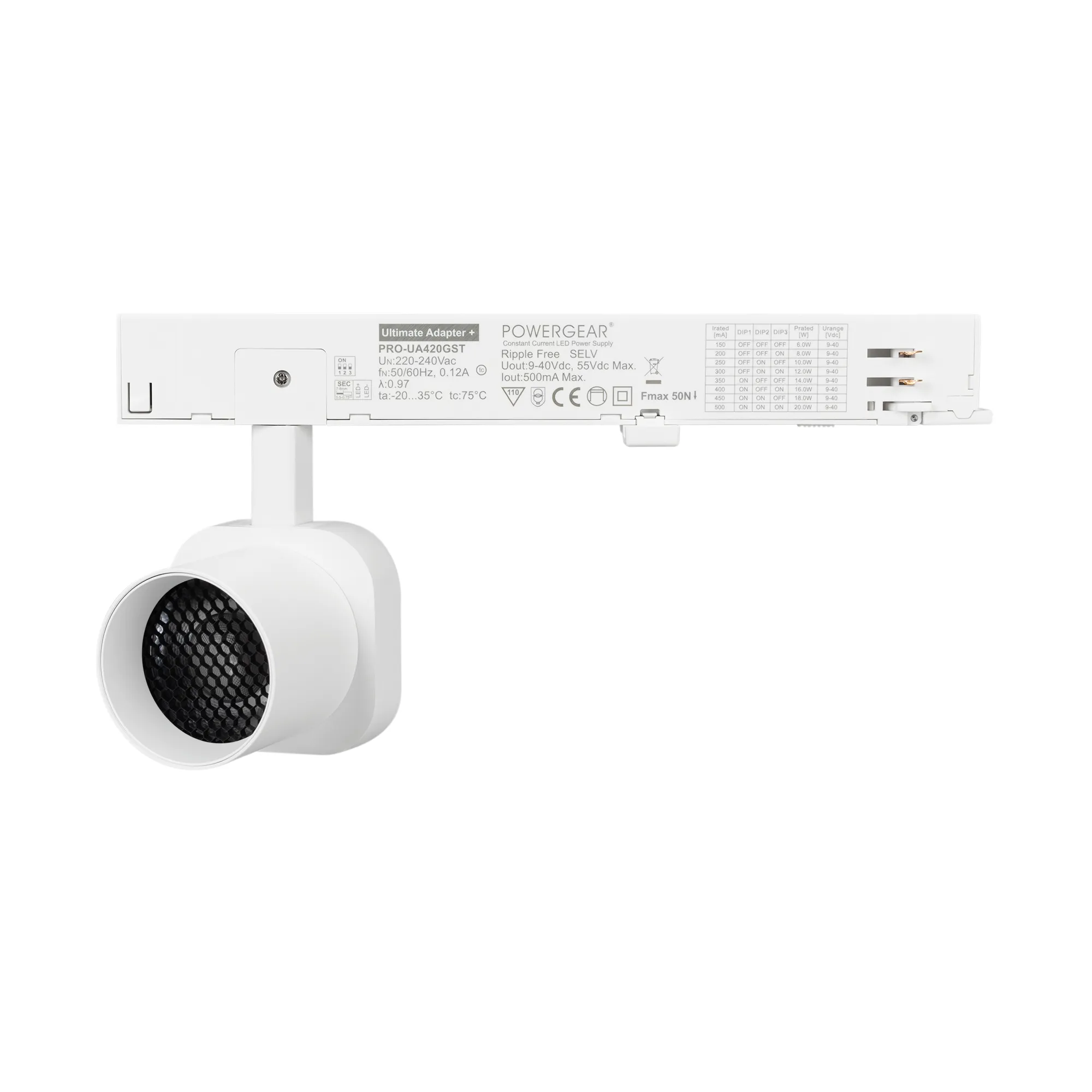 Светильник для треков/шин 4 провода. Мощность 10 Вт, св. поток 860 лм, 86 лм/Вт, теплый 3000 K, CRI>95, угол 38°, напряжение питания 230 В. Решетка HONEYCOMB в комплекте. Белый квадратный корпус из алюминия, материал линзы PC поликарбонат, степень защиты IP20. Размер световой части 60х60х62 мм. Монтаж на трек 3-фазный. Драйвер встроенный 9-40 В, 250мА., пульсация <1%