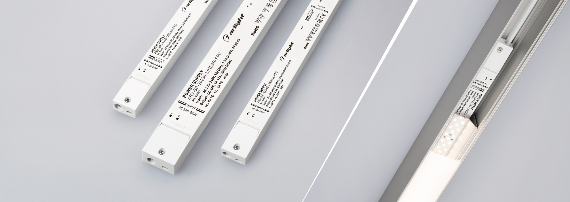 Тонкие блоки питания серии ARV-SP-LINEAR идеальны для размещения в профилях и других ограниченных пространствах, например, при производстве рекламных вывесок, лайтбоксов и компактных световых конструкций.